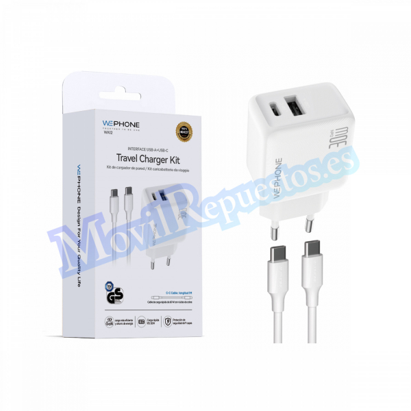 [WA12] Cargador De Pared De USB + Tipo-C PD30W Con Cable Tipo-C A Tipo-C – Blanco (REF-000119)